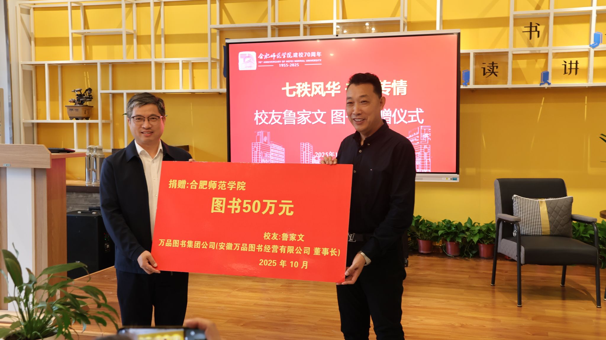 鲁家文是我院1994届政教专业校友,毕业后从事出版策划及发行工作,创办安徽万品图书经营有限公司、北京万品文化传媒有限公司、万品图书(上海)有限公司及线上实体和线下书店。在成功创业的同时,心系母校,个人出资向学校捐赠价值50万元图书,支持学校发展。(图书馆、校友办)