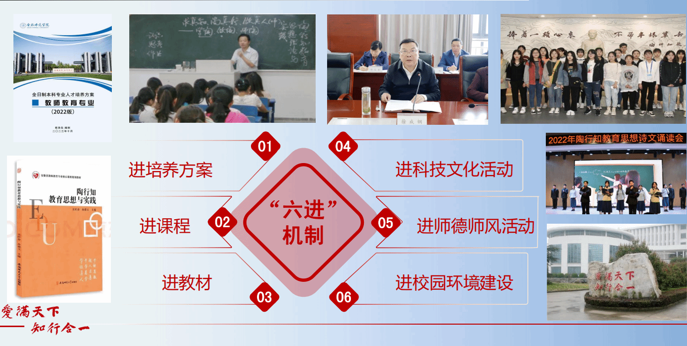 学校继承发展安徽籍“伟大的人民教育家”陶行知的教育思想,2011年把其深度融入并支撑师范生师德师能养成,将弘扬行知精神确立为校园文化建设的核心理念,明确了校园文化价值取向,确立了校园文化价值标准,体现了浓郁的师范特色。把师德教育和陶行知教育思想的继承发扬有机融合,全面落实行知文化进培养方案、课程、教材、科技文化活动、师德师风活动、校园环境建设的“六进”机制。通过师德教育“活课堂”——行知学堂,师范生学会用爱培育爱、激发爱、传播爱,实现学知师德、信守师德、践行师德的“知信行”统一。