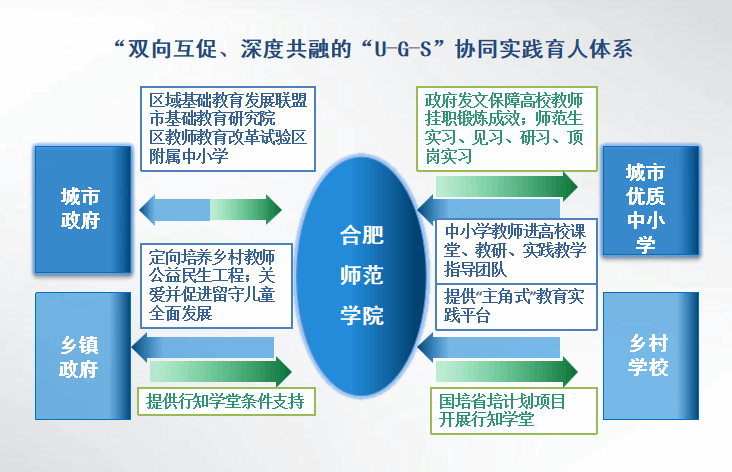 学校与合肥市、黄山市签署合作协议,建立“城市、乡村”双向促进、深度融合的“U-G-S”协同育人体系,让高校-城市和乡镇政府-城市优质和乡村学校深度共融,为师范生成长提供合力支撑。近年来选派78名教师赴中小学挂职副校长等,深度参与中小学教学、教研、学校管理等工作,提升教师培养师范生能力;选取城市优质中小学作为师范生实习实践基地,提高人才培养实践能力和创新精神。同时学校与乡镇政府、乡村中小学合作开设“行知学堂”,师范生作为“小先生”,既为农村留守儿童提供学习指导服务,又在教育实践中涵养了师德,提升教学育人能力。和传统相比,该模式实现了三个方面转变:在服务面向上,由区域中心城市向广大乡村扎根转变;在协同机制上,由松散、零碎化向紧密、规范化转变;在价值取向上,由师范生“独善其身”向“爱满天下”转变。
