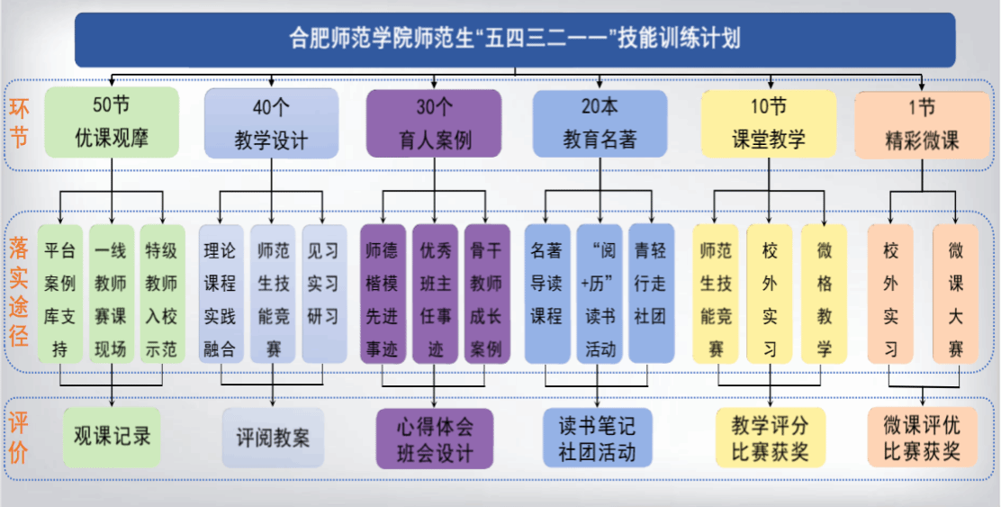 以《师范生技能训练与考核》《学生认知与学习专题》等教师教育课程、学科教学法课程和实习、见习、研习为依托,分级制定学习目标和考核任务,把“五四三二一一”师范生技能训练计划,递进融入师范生培养全过程。通过观摩50节优质课例,深度剖析经典案例,形成观察记录,领略名师与经典魅力。编写40个特色教案学案,对标基础教育新课标,落实“写-评-改”环节,锤炼教学设计能力。剖析30个育人案例,学习鲜活的师德模范案例,涵养师德,提升育人能力。精读20部教育名著,创新教育理念,形塑教育思想。师生共创10节真实课堂,实践教学中促进知-能转化,催生教学智慧。展示1节精彩微课,体现育人风采,落实产出导向,提升师范生教学和育人能力。