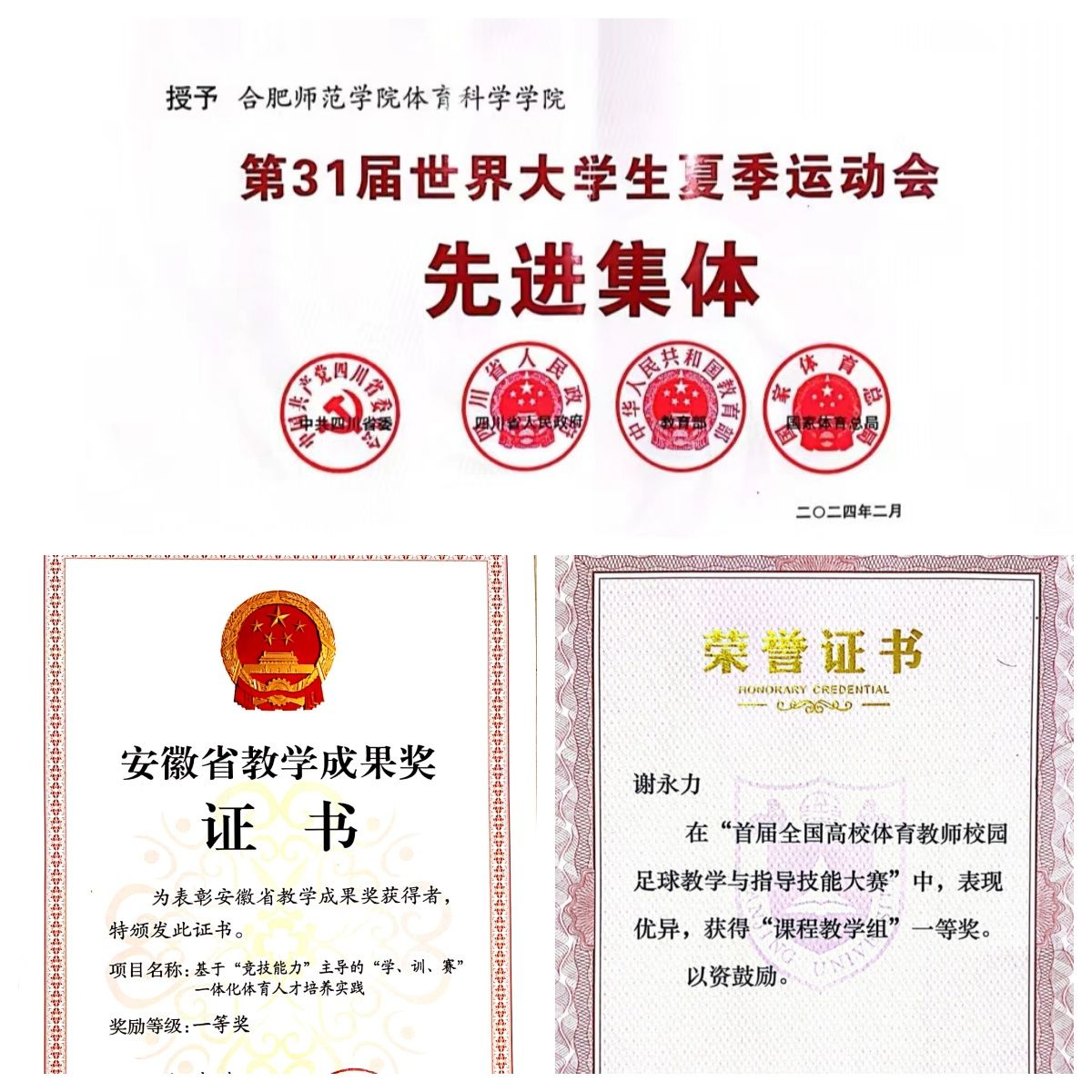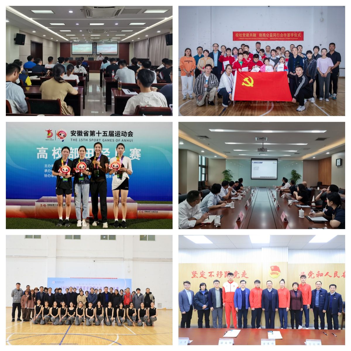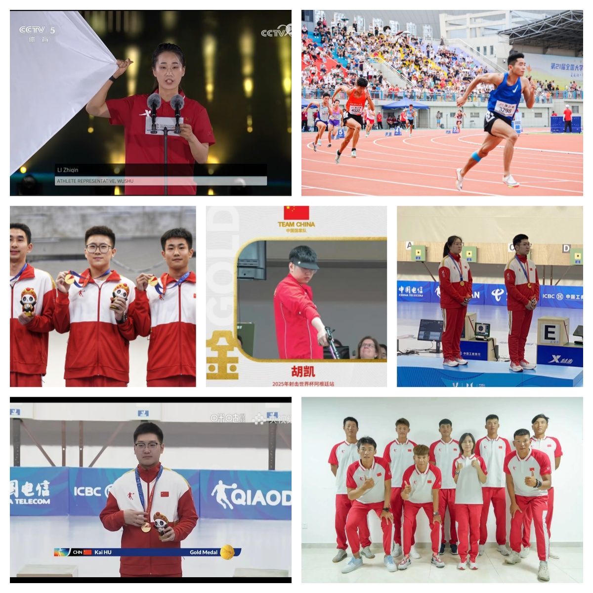2023年以来,学院在国际顶级赛事中斩获10金4银1铜,在省级以上赛事中获得58金70银38铜。李志勤老师获成都世界运动会60公斤级散打冠军并作为全球运动员代表发言。毕业生胡凯同学包揽2025年射击世界杯四站6金1银,李翔同学全国田径大奖赛夺冠并刷新安徽省混合4×400米接力纪录。男篮实现全省七连冠,学院男女篮在CUBAL东南赛区均创造历史最佳战绩;女足获全省亚军,男足获全省季军。
