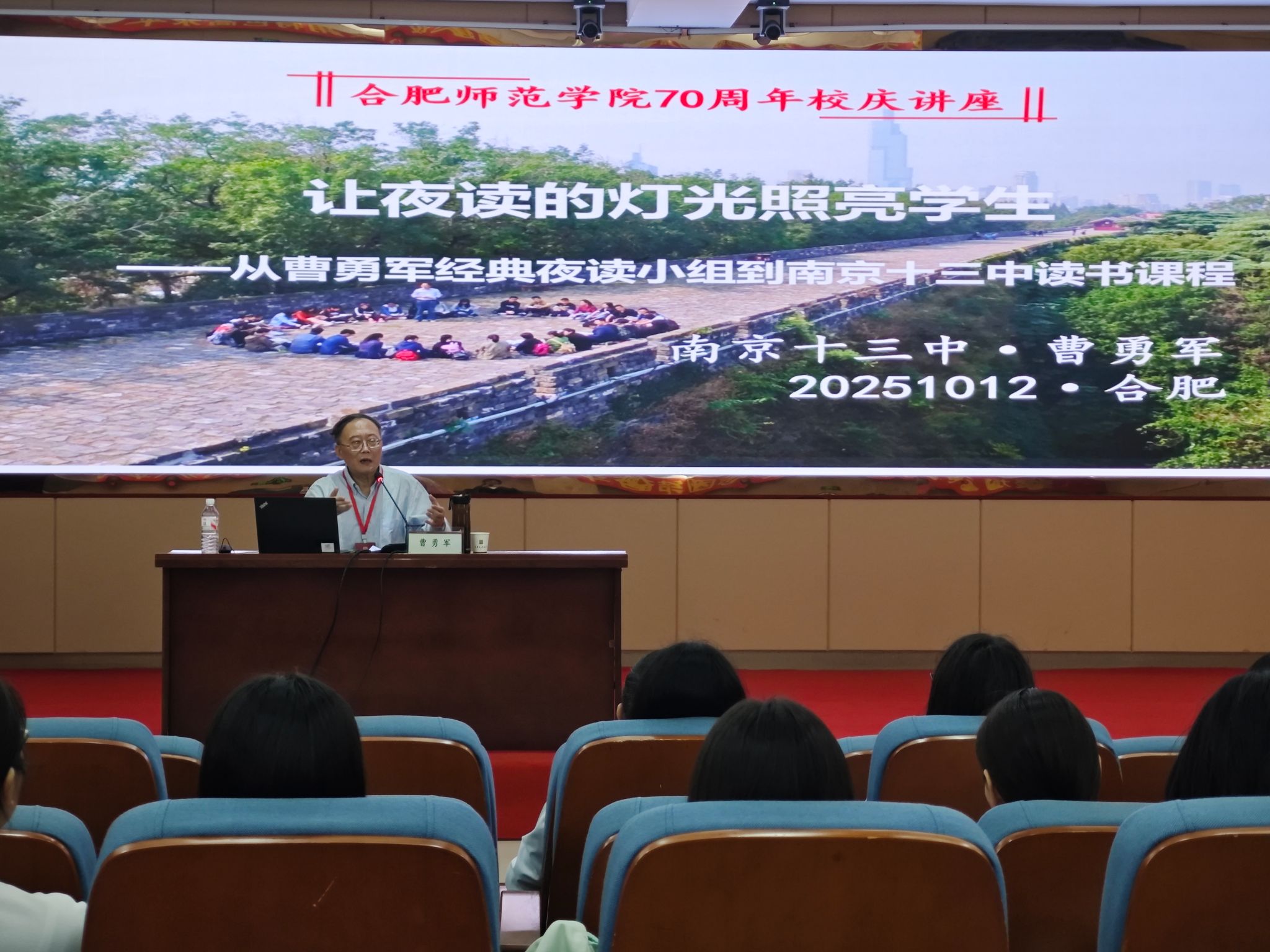 10月12日下午,由合肥师范学院科研处和文学院联合主办的70周年校庆学术讲座活动在锦绣校区学术报告厅举行。文学院1986届校友,江苏省特级教师、南京市十三中教授级高级教师曹勇军作了题为“让夜读之光照亮学生——从曹勇军经典夜读小组到南京十三中读书课程”的学术讲座。学院2024级、2025级学科语文教育硕士研究生和部分汉语言文学专业本科生参加讲座,讲座由文学院院长何旺生主持。讲座中,曹勇军以“整本书阅读”为切入点,分享了关于“...